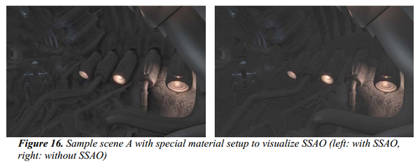 Screen-space Ambient Occlusion (SSAO)[7]:Crytek提出的首个屏幕空间环境光遮蔽算法,之后引来大量的研究及改进算法。也有用类似的概念去做近距离的反射,如SSDO[8]。