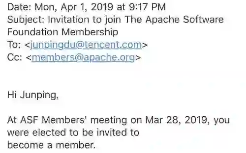 4 月 1 日,腾讯云大数据及人工智能产品研发的专家研究员堵俊平受邀成为 Apache 软件基金会成员,一封名为 “邀请成为 ASF 成员” 的电子邮件正式为堵俊平敲开了开源世界的新大门。
