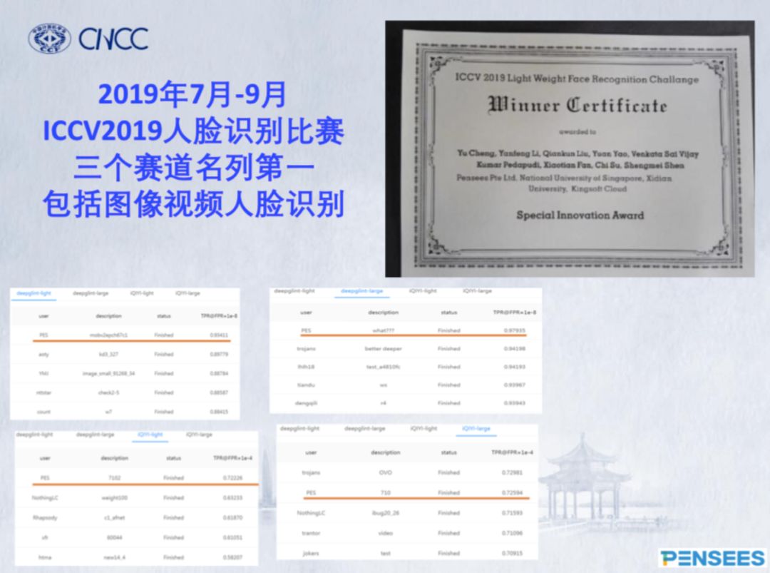李子青老师刚刚提到的ICCV的人脸识别比赛,我们在ICCV LFR挑战赛的轻量级图像识别、大型图像识别和轻量级视频图像识别三项竞赛中成绩第一,一个竞赛成绩第二。