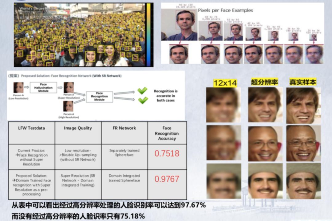 而我们的工作可以做到12×14(这是一个很小的脸),中间的结果是我们用深度学习的超分辨率方法恢复了他的人脸识别,我们在人脸识别的库上检测发现,用了深度超分辨率以后,我们的人脸识别性能从0.75提高到0.97。