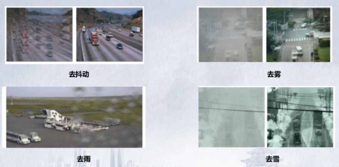 图像增强也包括去抖动,比如刮风时抖动引起来的图像模糊,以及去雾、去云、去雨的处理。