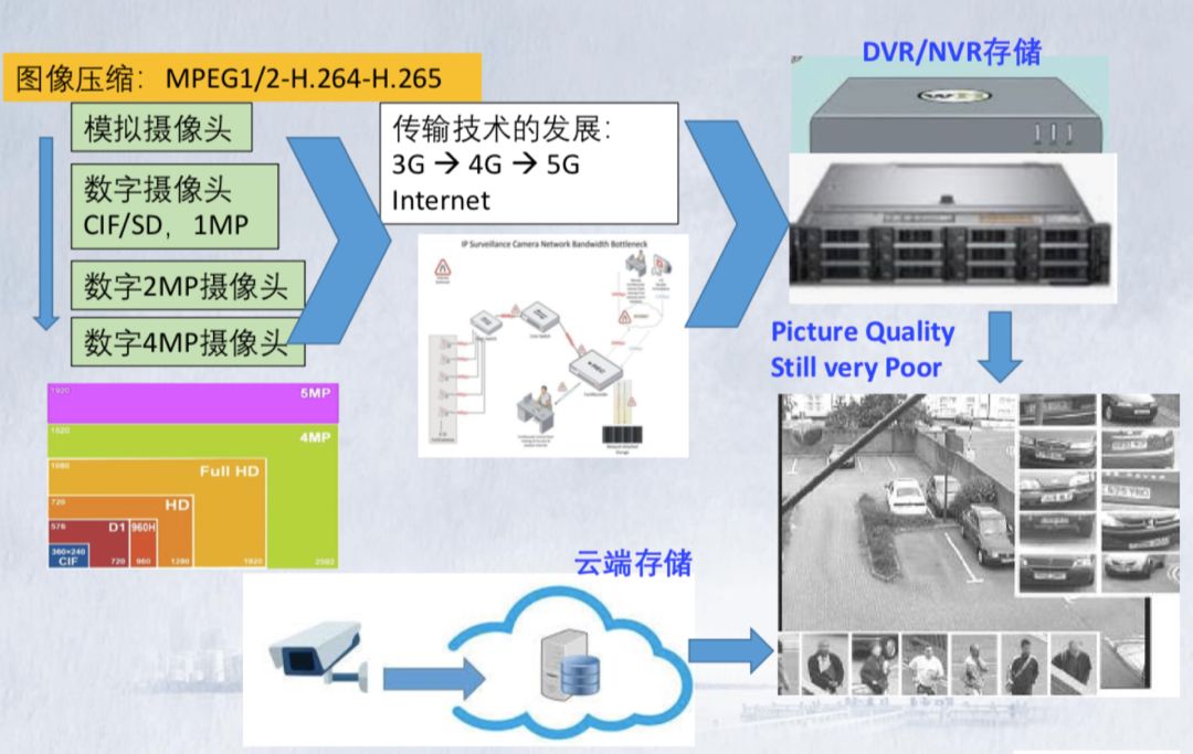 即使有这样的压缩,但现在摄像头的像素越来越高,摄像头的数目越来越多,即使有5G的出现,有云端的存储,我们最后的DVR、NVR(即使是云端的存储)也都是一种物理的存储。