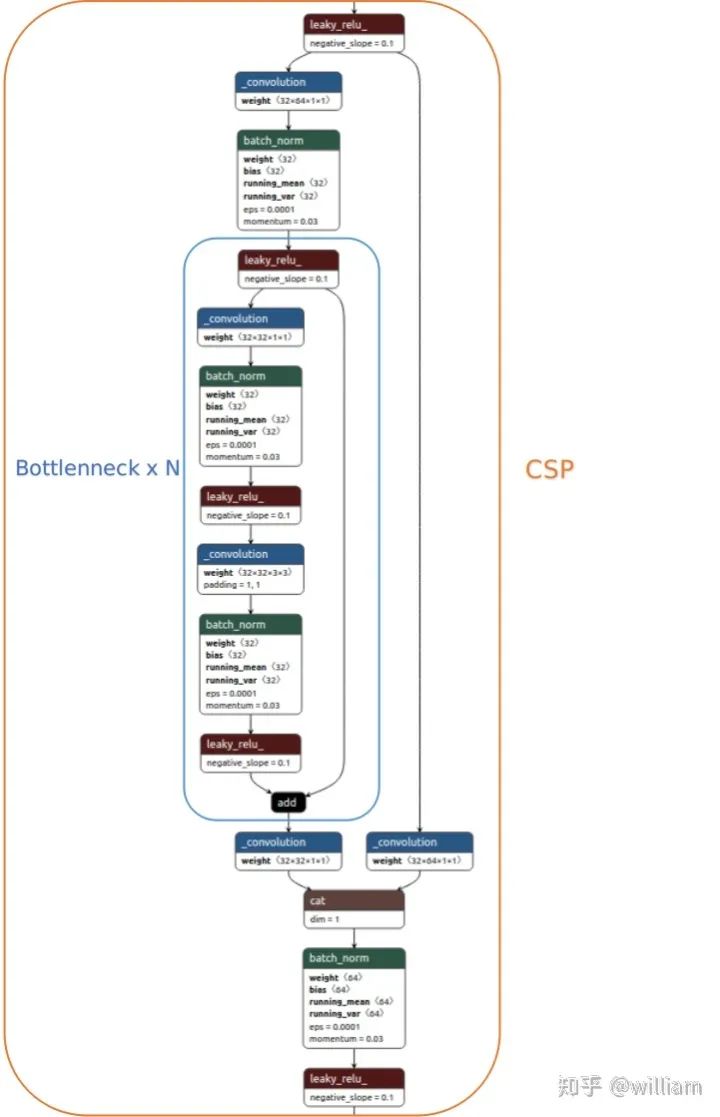 class Bottleneck(nn.Module):# Standard bottleneckdef __init__(self, c1, c2, shortcut=True, g=1, e=0.5): # ch_in, ch_out, shortcut, groups, expansionsuper(Bottleneck, self).__init__()c_ = int(c2 * e) # hidden channelsself.cv1 = Conv(c1, c_, 1, 1)self.cv2 = Conv(c_, c2, 3, 1, g=g)self.add = shortcut and c1 == c2def forward(self, x):return x + self.cv2(self.cv1(x)) if self.add else self.cv2(self.cv1(x))class BottleneckCSP(nn.Module):# CSP Bottleneck https://github.com/WongKinYiu/CrossStagePartialNetworksdef __init__(self, c1, c2, n=1, shortcut=True, g=1, e=0.5): # ch_in, ch_out, number, shortcut, groups, expansionsuper(BottleneckCSP, self).__init__()c_ = int(c2 * e) # hidden channelsself.cv1 = Conv(c1, c_, 1, 1)self.cv2 = nn.Conv2d(c1, c_, 1, 1, bias=False)self.cv3 = nn.Conv2d(c_, c_, 1, 1, bias=False)self.cv4 = Conv(2 * c_, c2, 1, 1)self.bn = nn.BatchNorm2d(2 * c_) # applied to cat(cv2, cv3)self.act = nn.LeakyReLU(0.1, inplace=True)self.m = nn.Sequential(*[Bottleneck(c_, c_, shortcut, g, e=1.0) for _ in range(n)])def forward(self, x):y1 = self.cv3(self.m(self.cv1(x)))y2 = self.cv2(x)return self.cv4(self.act(self.bn(torch.cat((y1, y2), dim=1))))