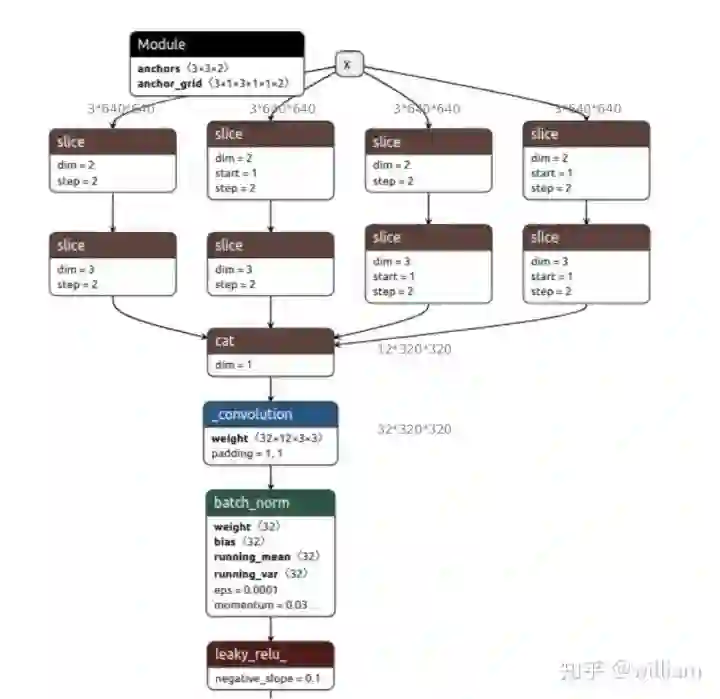 YOLO V5默认3x640x640的输入,复制四份,然后通过切片操作将这个四个图片切成了四个3x320x320的切片,接下来使用concat从深度上连接这四个切片,输出为12x320x320,之后再通过卷积核数为32的卷积层,生成32x320x320的输出,最后经过batch_borm 和leaky_relu将结果输入到下一个卷积层。