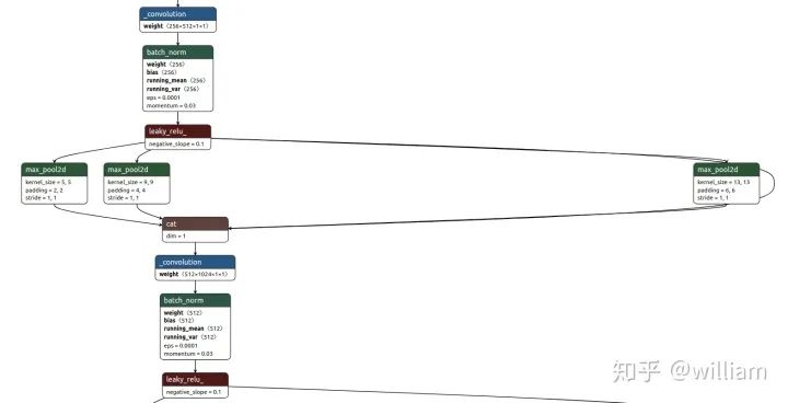 SPP的输入是512x20x20,经过1x1的卷积层后输出256x20x20,然后经过并列的三个Maxpool进行下采样,将结果与其初始特征相加,输出1024x20x20,最后用512的卷积核将其恢复到512x20x20。