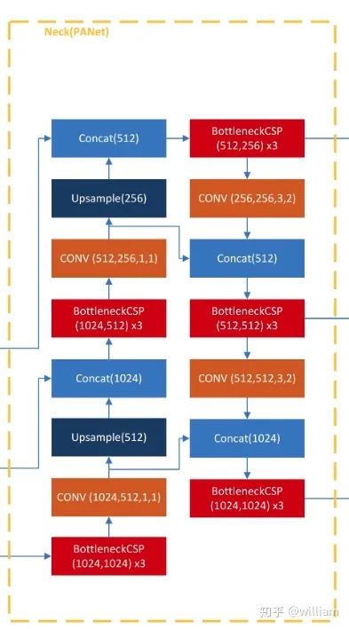 2)Neck:一系列混合和组合图像特征的网络层,并将图像特征传递到预测层。
