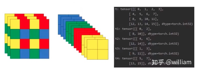 核心为这段代码self.conv(torch.cat([x[..., ::2, ::2], x[..., 1::2, ::2], x[..., ::2, 1::2], x[..., 1::2, 1::2]], 1)) 。x[..., ::2, ::2]是黄色部分,x[..., 1::2, ::2],是红色部分,以此类推。对于x[..., ::2, ::2]其中第一个参数“..."代表深度,也就是说三个通道都要切,第二个和第三个代表不论是宽和高都是每隔一个采样。对于x[..., 1::2, ::2],1::2代表从列位置1开始,也就是每序号奇数列采样。蓝色,绿色的生成方式以此类推。最后用cat连接这些隔行采样图,生成通道数为12的特征图。