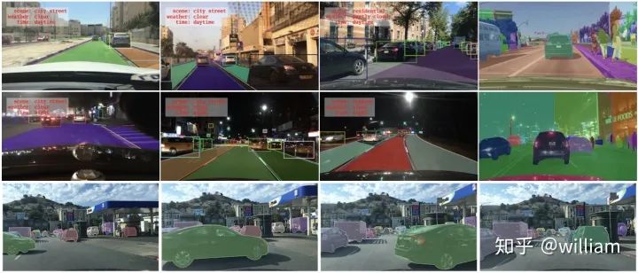BDD100K是最大的开放式驾驶视频数据集之一,其中包含10万个视频和10个任务,目的是方便评估自动驾驶图像识别算法的的进展。每个高分辨率视频一共40秒。该数据集包括超过1000个小时的驾驶数据,总共超过1亿帧。这些视频带有GPU / IMU数据以获取轨迹信息。该数据集具有地理,环境和天气多样性,从而能让模型能够识别多种场景,具备更多的泛化能力。这些丰富的户外场景和复杂的车辆运动使感知任务更具挑战性。该数据集上的任务包括图像标记,车道检测,可驾驶区域分割,道路对象检测,语义分割,实例分割,多对象检测跟踪,多对象分割跟踪,领域自适应和模仿学习。我们可以在BDD100K数据网站上下载数据。