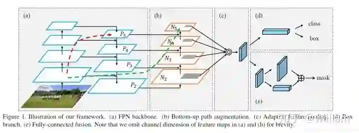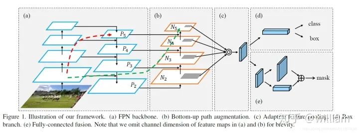该网络的特征提取器采用了一种新的增强自下向上路径的 FPN 结构,改善了低层特征的传播(a部分)。第三条通路的每个阶段都将前一阶段的特征映射作为输入,并用3x3卷积层处理它们。输出通过横向连接被添加到自上而下通路的同一阶段特征图中,这些特征图为下一阶段提供信息(b部分)。横向连接,有助于缩短路径,被称为shortcut连接。同时使用自适应特征池化(Adaptive feature pooling)恢复每个候选区域和所有特征层次之间被破坏的信息路径,聚合每个特征层次上的每个候选区域,避免被任意分配(c部分)。对于 Mask-RCNN(e部分),FCN可以保留空间信息并减少网络中的参数数量,但是由于参数是为所有空间位置共享的,因此该网路实际上并未学习如何使用像素位置进行预测。而FC对位置敏感,可以适应不同的空间位置。因此PANet使用来自**Fully Convolutional Network (FCN)和Fully-connected layers(FC)**的信息提供更准确的掩码预测。