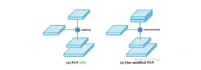 PANET通常使用自适应特征池将相邻层加在一起,以进行掩模预测。但是,当在YOLOv4中使用PANET时,此方法略麻烦,因此,YOLO V4的作者没有使用自适应特征池添加相邻层,而是对其进行Concat操作,从而提高了预测的准确性。