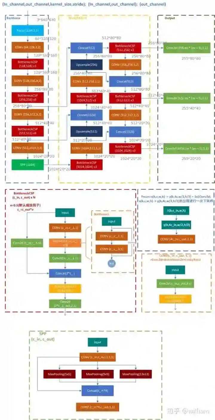 下图中存在三种括号,其中 In_channel:输入通道,out_channel:输出通道,Kernel_size:卷积核大小,Stride:步长,x N代表此模块的叠加次数,方框外数字:depth x weight x height,默认输入为宽高为640x640的三通道图像。