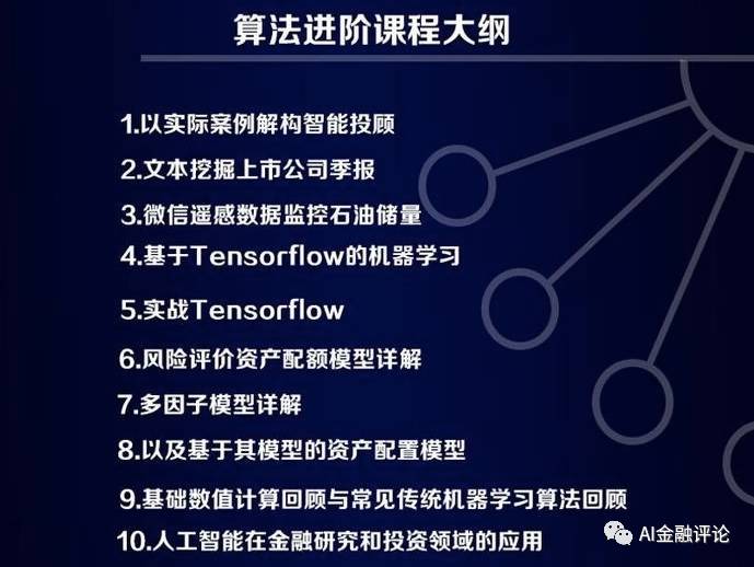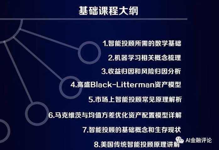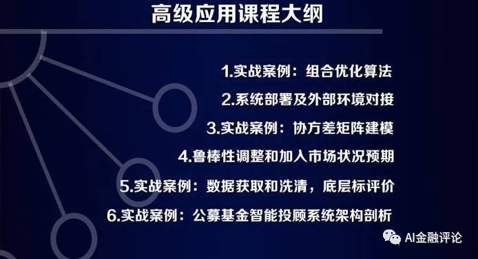 智能投顾课程体系包括智能投顾的概念原理模型简介等基础性内容;也包括TensorFlow和深度学习模型的应用,自适应建模和优化在量化投资中的应用以及文本挖掘算法等进阶性内容;还包括智能投顾系统架构,从数据清洗到大类资产配置再到智能调仓和组合监控等高级内容。