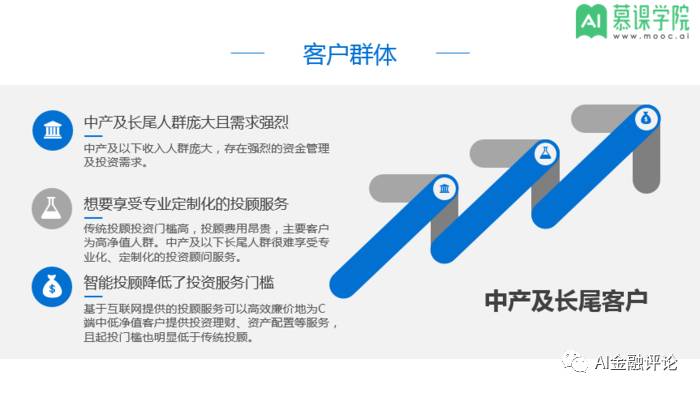 智能投顾的目标客户主要面向中产及长尾客户。中产及以下收入人群庞大,存在强烈的资金管理及投资需求。庞大的中产阶级人群,除了购买常见的金融产品之外,还存在资产配置的需求。
