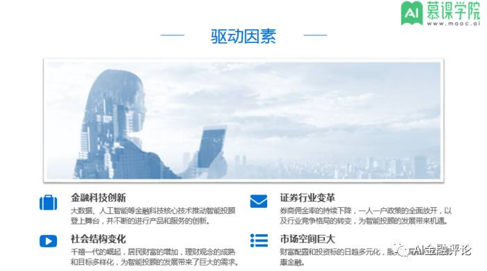 驱动因素一:金融科技创新。大数据、人工智能等金融科技核心技术推动智能投顾登上舞台,并不断的进行产品和服务的创新。