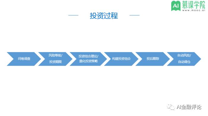 智能投顾的投资过程基于传统的投资理论和方法策略,实质上是将传统投资理论的应用场景互联网化。大部分智能投顾平台会借助问卷等手段判别用户的风险承受水平、收益要求和投资期限等信息,部分智投平台更是直接让用户先后勾选风险等级和投资期限。无论是以问卷形式还是简单粗暴直接勾选风险承受等级和投资期限,都相当于是对客户的可投资资产风险和预期收益的分析,相当于给平台构建投资组合设定了约束条件。根据客户的风险水平与投资期限,计算机借助风险分散等传统的投资理论以及量化投资策略等方法构建投资组合,并在投后过程实时跟踪宏观事件、市场和投资者偏好的变化等情况,进行自动风控和授权后的自动调仓。