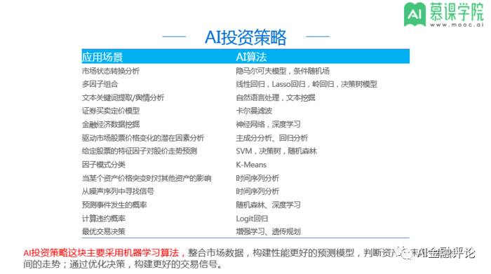 AI投资策略这块主要采用机器学习算法,整合市场数据,构建性能更好的预测模型,判断资产在未来一段时间的走势;通过优化决策,构建更好的交易信号。
