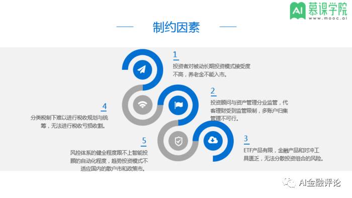 智能投顾当前在美国已经发展得如火如荼,国内很多券商和互联网公司也跃跃欲试,不过将智能投顾迁移到国内发展,仍受到一些现实方面因素的制约。