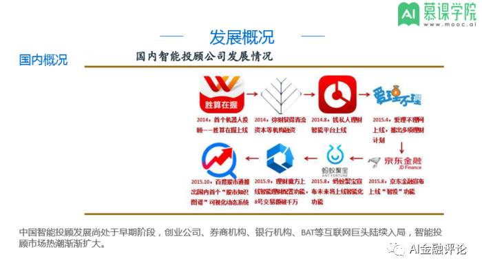 随着人工智能,大数据分析等技术的发展,智能投顾在2015年突然呈现爆发式增长态势,传统金融机构意识到其对传统投顾市场的威胁,亦纷纷成立智能投顾部门,或通过收购创业公司,涉足智能投顾领域。
