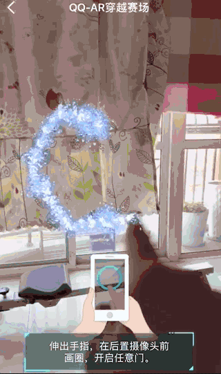 而通过点开手机QQ扫一扫内部新设置的“QQ-AR穿越赛场”按钮,就可以进入活动页面,然后在摄像头后画圈就能激活AR任意门功能。