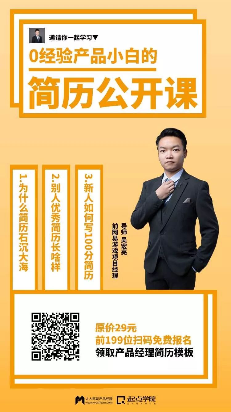 为了帮助0经验、想入行产品经理的新人更好的认知&理解【简历写作技巧】,6月20日(周四)晚20:00-21:00,人人都是产品经理社区&起点学院特邀知乎TOP1职业规划课程作者@吴宏亮老师莅临产品公开课。