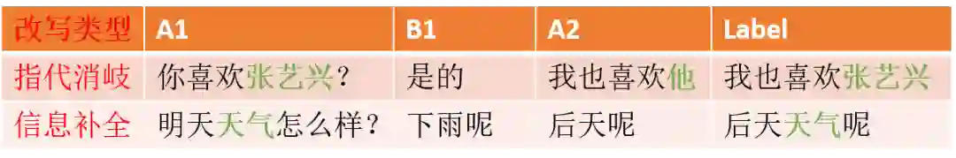 对于用户和系统的对话历史,本文用A1/B1来分别表示用户说的话和系统的回复。对于用户说的话A2,本文要将它改写为label。