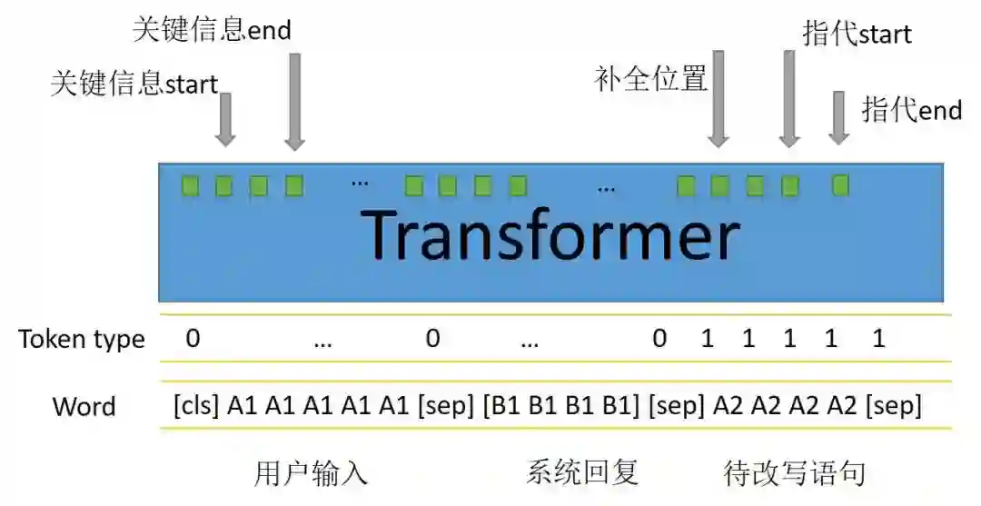 当待改写语句中不存在指代词或者关键信息的补全时,指代的start和end将会指向cls,同理补全位置也这样。如同阅读理解任务中不存在答案一样,这样的操作在做预测任务时,当指代和补全位置的预测最大概率都位于cls时就可以避免改写,从而保证了改写的稳定性。