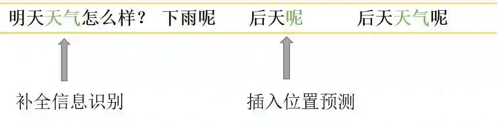 对于信息补全类,先是识别出上下文中的关键信息“天气”,然后识别出A2中需要补全信息的位置在"呢"之前。