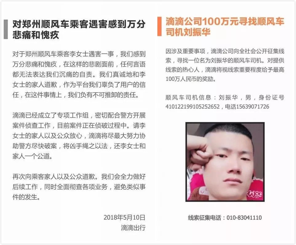 济南21岁空姐5月6日落地郑州之后失联,最终于昨日(5月10日)经警方证实是被滴滴顺风车车主恶意奸杀、抛尸。此事被媒体曝光之后,滴滴才站出来干了这几件事: