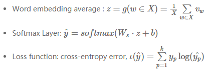 论文首先提出了一个最简单的无序模型Neural Bag-of-Words Models (NBOW model)。该模型直接将文本中所有词向量的平均值作为文本的表示,然后输入到softmax 层,形式化表示如下: