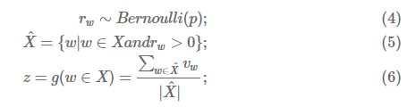 针对DAN模型,论文提出一种word dropout策略:在求平均词向量前,随机使得文本中的某些单词(token)失效。形式化表示如下: