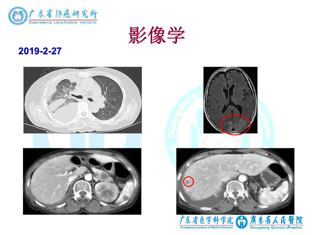 ② 2019-2-27,日胸腹增强CT和头颅MRI示:右侧胸腔大量积液。左肺多发结节、右侧胸膜多发结节及肿块、纵隔及右侧肺门淋巴结增大,均考虑转移。脑实质、脑膜、骨、肝、双肾、右侧肾上腺、胰腺尾部、脾脏及腹膜后淋巴结多发转移。
