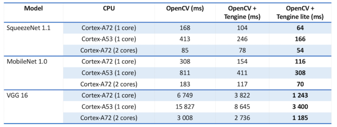 OpenCV的合作伙伴OpenAI Lab通过使用其新的“ Tengine lite”(更轻量的C语言中Tengine的重新实现),进一步提高了OpenCV DNN在ARM上的性能。这是比较性能表(batch_size = 1,已在EAIDK-610上进行了测试):
