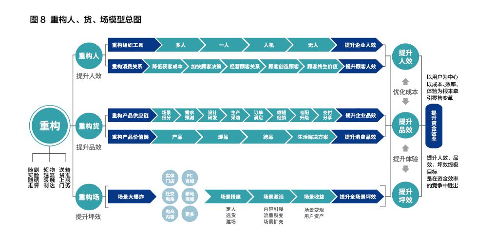 更重要的是“人、货、场之间的交叉协同重构”,即人效与品效的协同,品效与坪效的协同,人效与坪效的协同(如图8)。