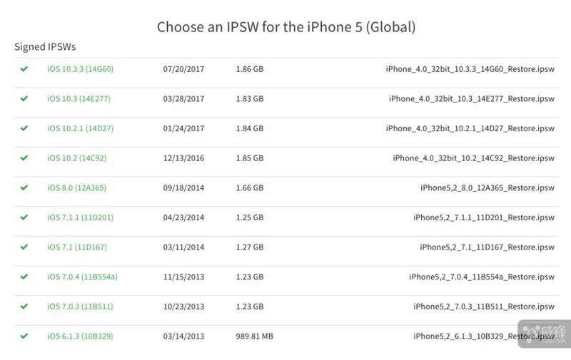 大家现在可以前往威锋网固件中心去下载对应的固件,在 ipsw.me 上,能够降级的设备固件已经从之前的红色变为了绿色。一般每台手机都能够刷回属于它那那个时代的那一版系统,iPhone 5 最早就能够降级到 iOS 6.1.3,而 iPhone X 则只能降级到 iOS 11.2。具体的机型统计如下,看看你的手机能够刷到哪一版系统吧!