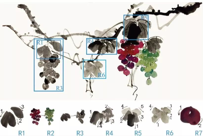 R7:圆形约束(Rounding):在水墨画绘制过程中,通常使用两个笔画来绘制一个圆形物体,如葡萄、眼睛、花瓣等。这两个笔画的起始端点十分接近,两终点距离亦然。
