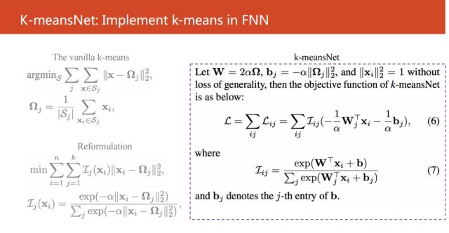 如果大家只看左边的神经网络,大家可能会觉得非常不稀奇,好像就是一个很简单的Sigmoid函数,再加上一个隐含层的神经网络。但是如果结合右边的公式来看,就会发现,这么简单的神经网络是等价于K-means的。