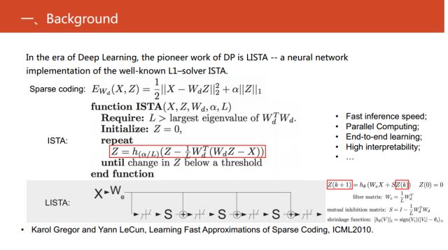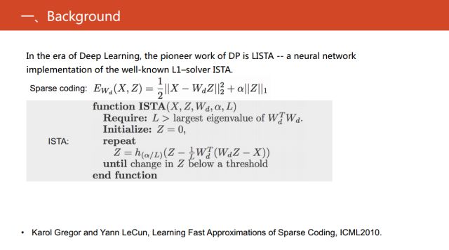 下面给大家介绍一下我们的第一个工作。我们这项工作从可微编程出发,来研究稀疏编码的优化方法—ISTA 。