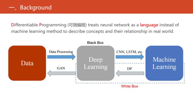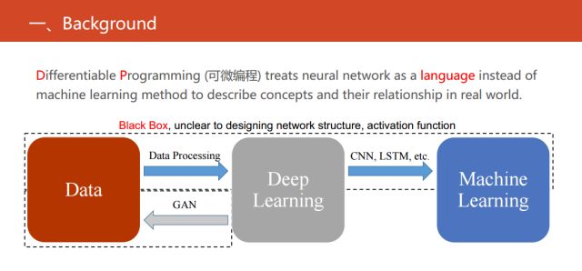现在深度神经网络已经占据了绝对的优势,可微编程提供了从高解释性的角度去做这件事,它是将神经网络作为一种语言,将传统的算法转化成神经网络以后,一定程度上缓解了一些深度学习的不足。