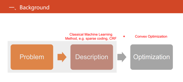 针对现实世界中的一些问题,传统的机器学习的方法思路是首先基于一些假设或者先验知识(比如稀疏编码等),将其形式化成目标函数,再对其进行优化求解。但当得到一个新的目标函数时,我们还需要研究目标函数数学上的性质对其进行优化,如目前最流行的优化方法--凸优划。