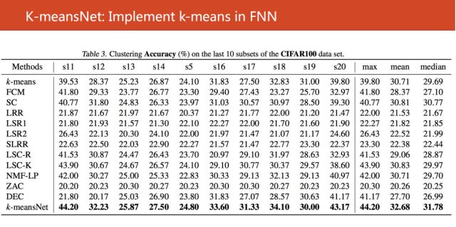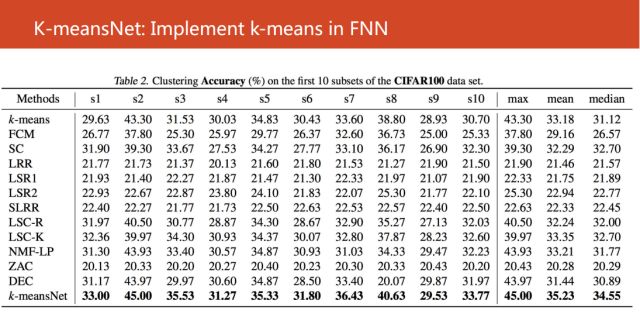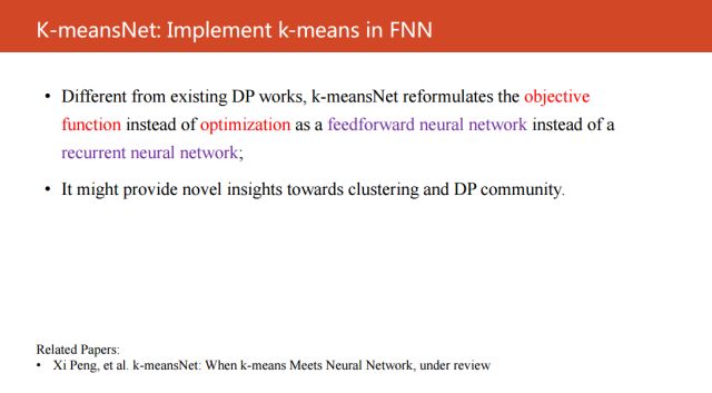 第二个工作较之前更进一步,是在聚类这个背景下来扩展,把k-means这个聚类算法转化成为一个前向式记忆网络。不同于现有的可微编程的方法,它是从优化的角度出发,我们直接把k-means聚类算法的目标函数直接进行变形,然后建立对应的神经网络模型。