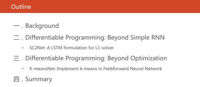 我相信这样介绍大家可以有一个直观的概念。目前可微编程就是对传统的机器学习的一个逆向的过程,由于传统的机器学习的结构非常清晰,对逆向过程可以产生的神经网络,就可以知道哪一个激活函数的作用是什么,每一层的输出、目的是什么,这也是现有的深度学习方法所不具备的优势。