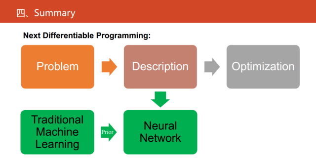 下一步可微编程做什么?现在的可微编程是对传统的继续学习方法的等价或者一种替代物。从问题的描述,再到问题的建模、求解,这是一个很复杂的过程。如果我们对传统的学习的方法,在一定的假设和前提下已经有建好的建模,我们建立等价的神经网络,其实就能走出最容易的一步。