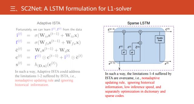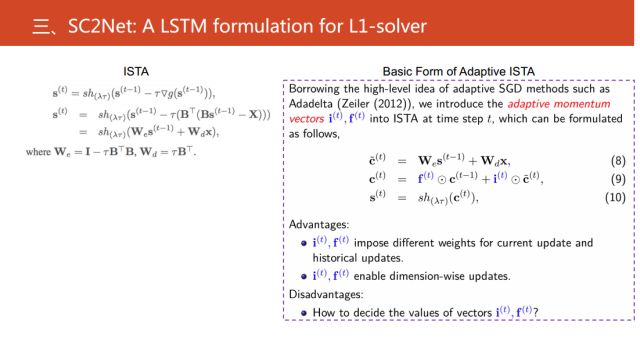 左边是ISTA的关键的优化步骤,基于此,我们引进了动量向量(i(t),f(t))。这就是标准的受益于现代的优化的一些相关的方法,通过引入这两个量,从而解决非自适应更新问题和没有考虑历史信息的不足。更进一步来看,这里存在一个问题,i(t),f(t)如果是两个向量的话,只能确定它的值。使用传统的机器学习方法进行训练,我们人为指定它的值。在研究中,发现可以把这两个向量当成两个变量从数据中学习,就产生了我们提出的自适应ISTA。