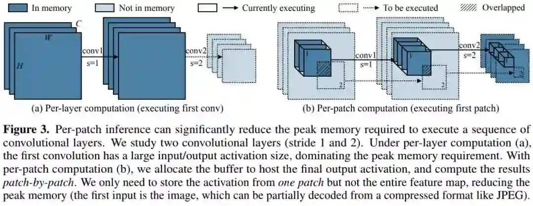 以上图stride=1/2的图示为例,对于逐层计算方式,第一层具有大输入输出尺寸,导致非常高内存占用。通过空域拆分计算,我们以patch-by-patch方式开辟buffer并进行计算,此时我们仅需保存一个块的buffer而非完整特征图。