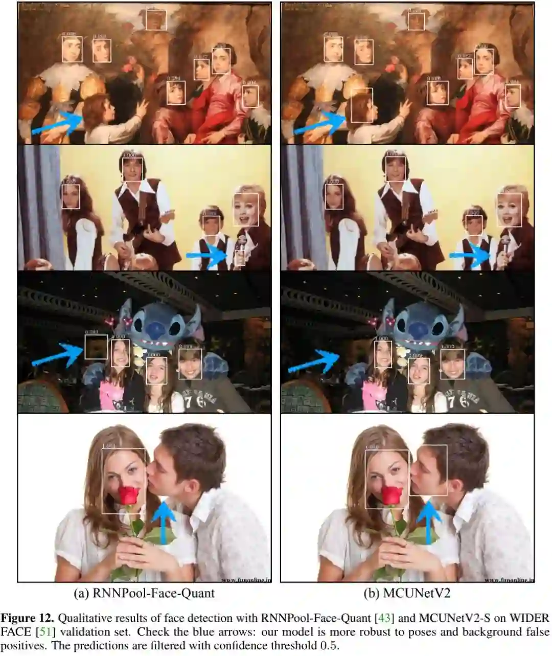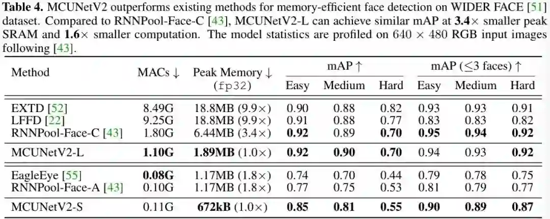 MCUNetV2-L取得了同等检测性能,但峰值内存被RNNPool-Face-C小3.4x,比LFFD小9.9x;计算量分别小1.6x与8.4x;