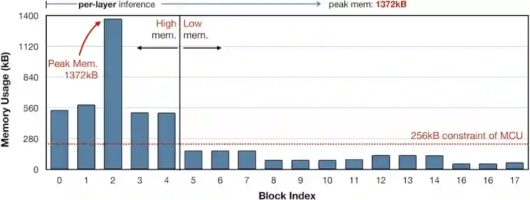 由于有限的内存,MCU(MicroController Units, MCU)端的TinyDL极具挑战性。我们发现:内存瓶颈源于CNN设计导致的内存分布不平衡 ,即网络的前几个模块具有比其他模块大的多的内存占用。
