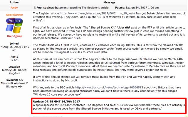 Betaarchive 发表官方声明,称文件夹大小仅仅为 1.2GB,并非是机密数据。微软发言人随后也证实,这些源代码是通过共享代码计划与 OEM 厂商和合作伙伴分享的源代码的一部分。(来自:Solidot)