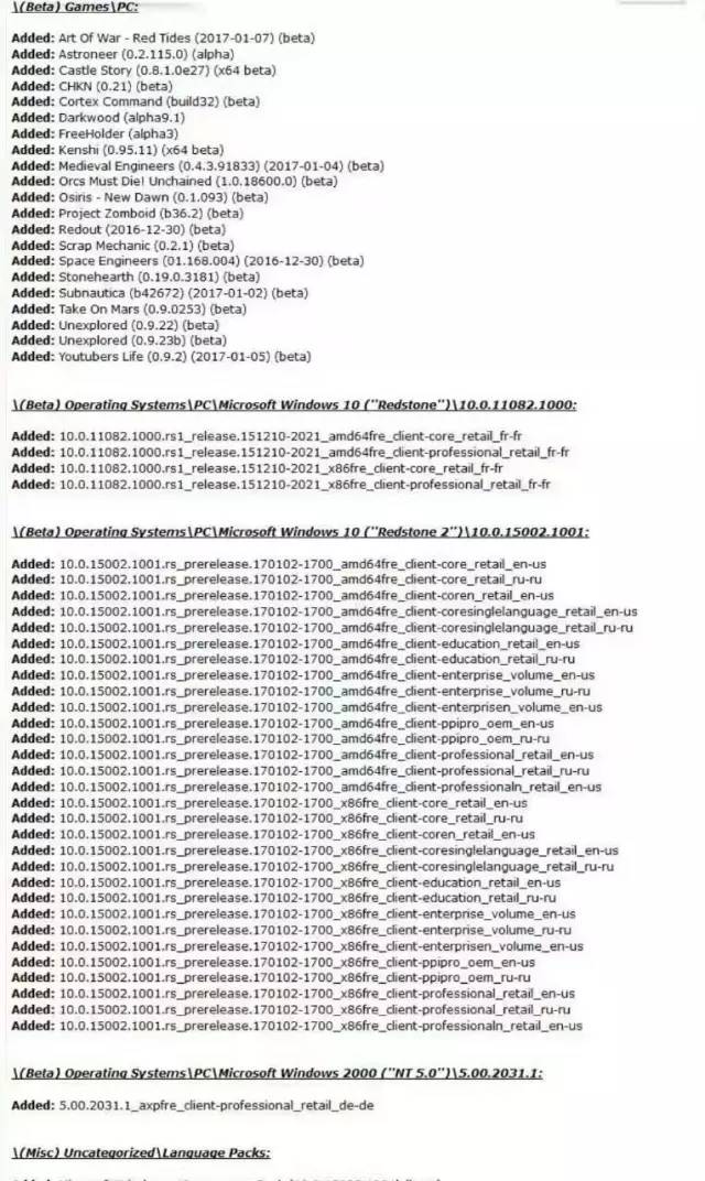除此以外,至今尚未公开发布的Windows 10以及Windows Server 2016版本也一并被泄露出来。这些机密的版本本来是微软工程师出于寻找bug和测试目的而开发的,里面包括了私密的调试符号,在公开发布时往往会剔除掉。但是对于黑客来说,那些符号往往能透露重要信息。