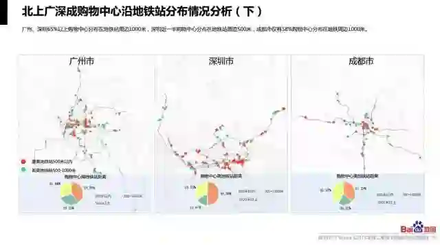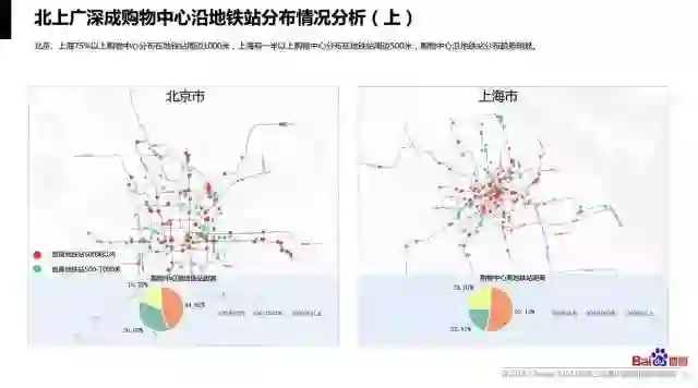 北京、上海75%以上购物中心分布在地铁站周边1000米,上海有一半以上购物中心分布在地铁站周边500米,购物中心沿地铁分布趋势明显。广州、深圳65%以上购物中心在地铁站周边1000米,深圳近一半购物中心分布在地铁站周边500米。