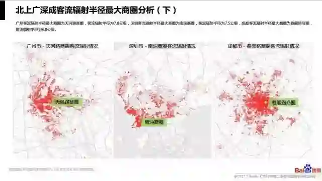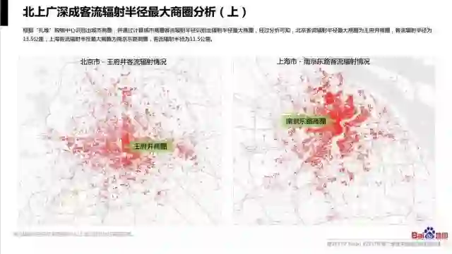 北京客流辐射半径最大商圈为王府井商圈,客流辐射半径为13.5公里;上海客流辐射半径最大商圈为南京东路商圈,客群辐射半径为11.5公里;广州客群辐射半径最大商圈为天河路商圈,客流辐射半径为7.8公里;深圳客流辐射半径最大商圈为南田商圈,客流辐射半径为7.5公里;成都客流辐射半径最大商圈为南田商圈,客流辐射半径为6.8公里。